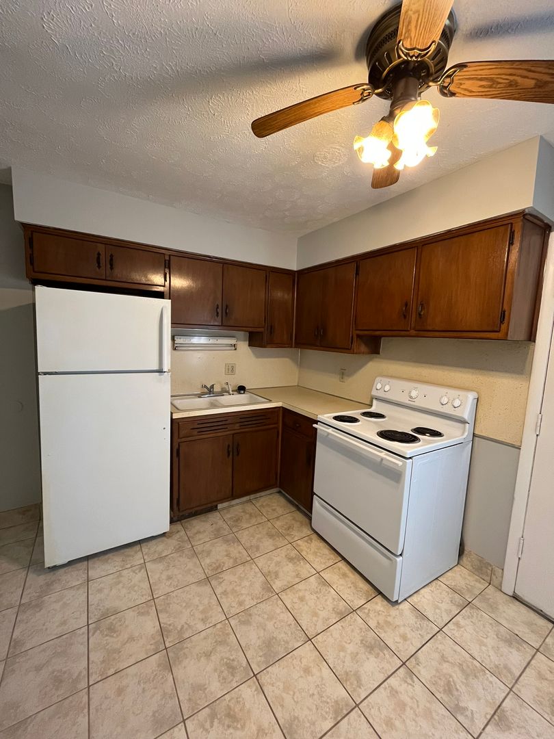 The eat-in kitchen features rich brown cabinetry, a white refrigerator, an electric stove, and a double-well sink with ample storage space. The unfinished basement provides washer and dryer hookups along with plenty of additional storage space.