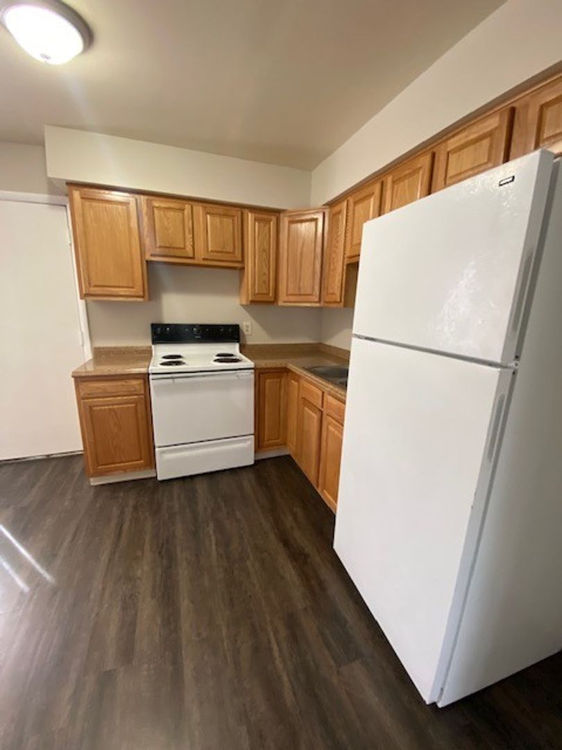 Set in a residential neighborhood, away from the hustle and bustle, this 2 bedroom, 1 bath townhome has been updated. As soon as you enter the front door, you are greeted by fantastic vinyl plank flooring that extends from the living room to the kitchen. The eat-in kitchen for this home has a white refrigerator and electric stove with abundant oak cabinet space and a double well sink. The unfinished basement provides washer and dryer hookups as well as a wealth of storage space. Window-mounted air conditioners are provided in the bedrooms, along with a large closet space. The Sanborn Place community provides plenty of green space to enjoy, as well as reserved parking, for a great price!