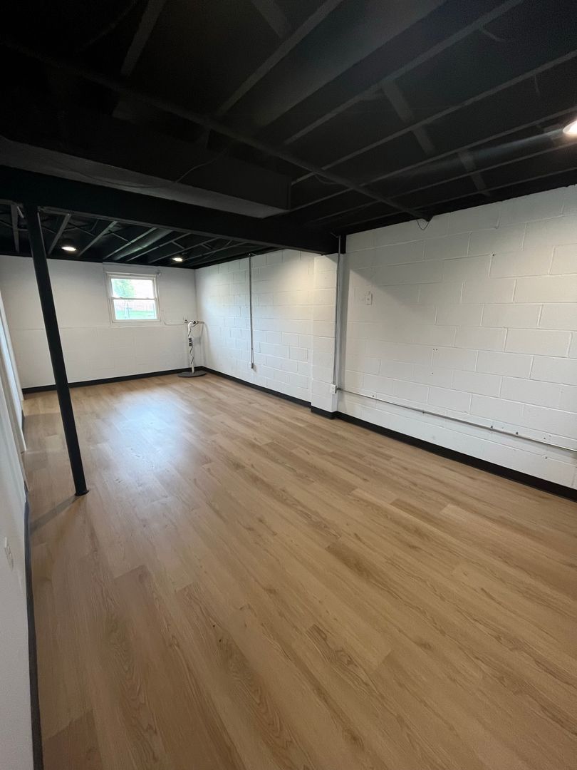 Down the hallway are three well-sized bedrooms with new carpet and a refreshed full bathroom. The partially finished basement provides a versatile flex space—perfect for a home office, gym, or additional living area—and includes a separate laundry room with washer and dryer hookups, plus a convenient half bathroom.