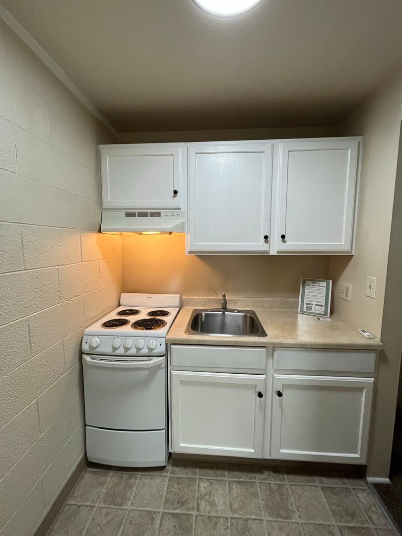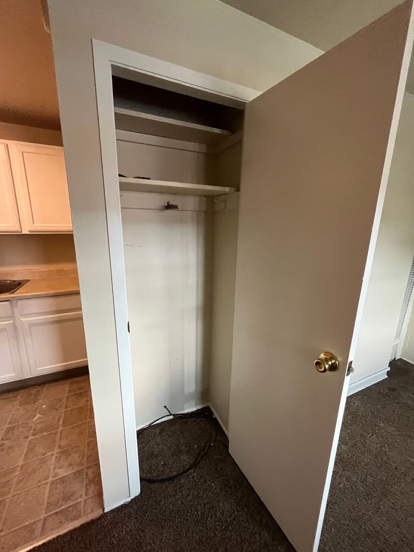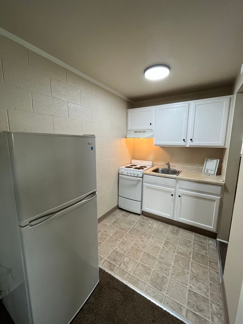 Inside, you’ll find a comfortable living room—spacious enough for your favorite furniture—with a convenient coat closet for extra storage. The kitchen, while compact, offers everything you need with an oven, refrigerator, and cabinetry to keep things organized. The bedroom is a comfortable retreat with its own closet and an en-suite bathroom for privacy.