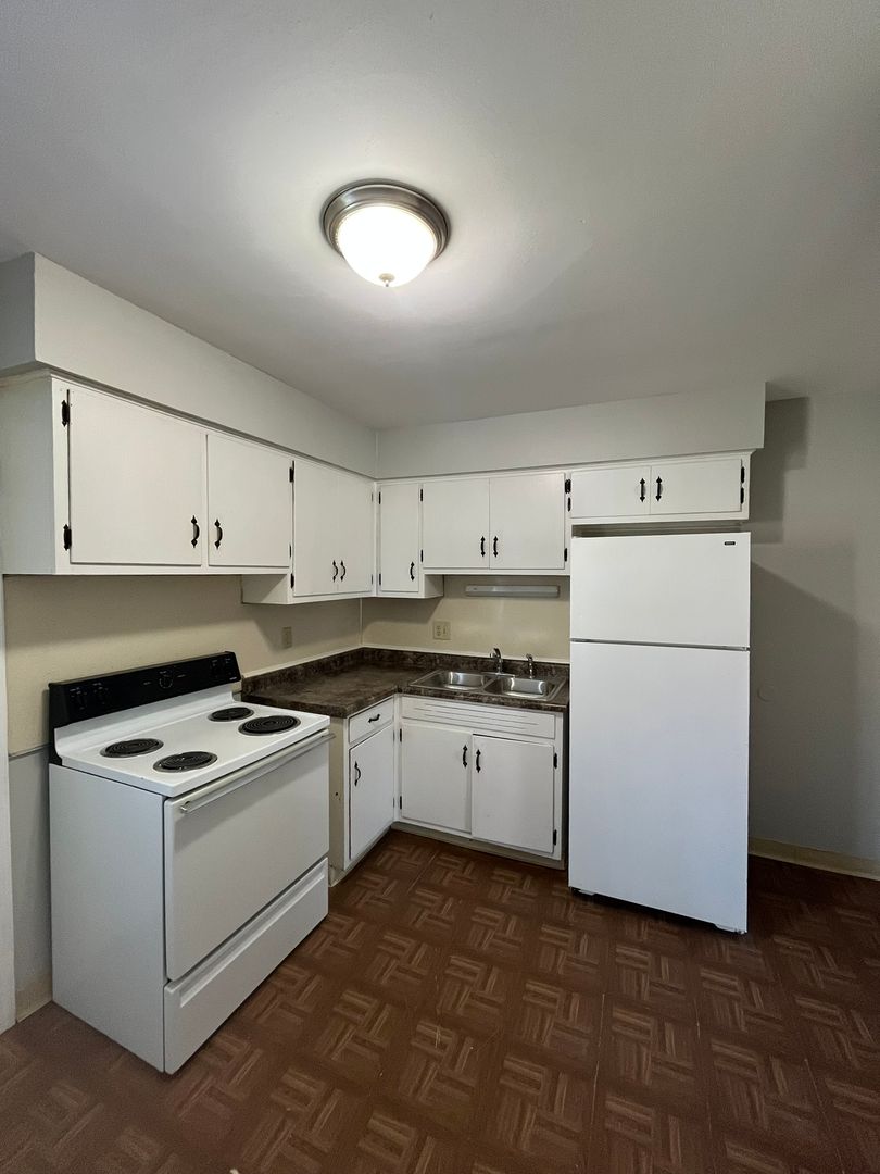 The eat-in kitchen features white cabinets, a white refrigerator, electric stove, and a double-well sink with ample storage space. The unfinished basement provides washer and dryer hookups along with plenty of additional storage space.