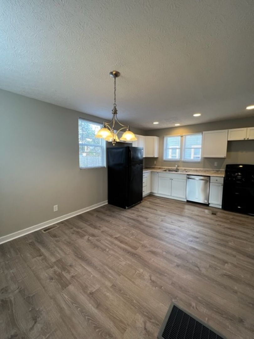 This charming 2-bedroom, 1-bath single-family home is available for pre-lease! The main level features attractive plank flooring and an updated kitchen with crisp white cabinetry, new countertops, and included appliances—refrigerator, dishwasher, and oven. A spacious living room and dining area provide plenty of room to relax and entertain.